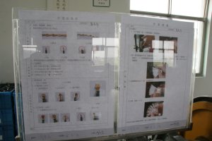 工場では工程毎に作業指示書が掲示されています。 横ではQC(クオリティチェック)リーダーが工員の作業を監視し、細かい品質のチェックを行います。 |