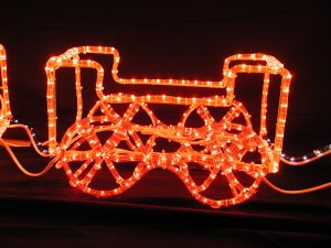 汽車のイルミネーションです。 点滅コントローラが付属しており、車輪の部分が点滅します。車輪が回っているように見えます。 屋外で使用可能です。 商品コード SPLT-BC-3-TRAIN 商品名 3連汽車ポッポ 価格 税込10,032円(税抜9,120円、消費税912円) 高さ 汽車52cm、貨車29cm 幅 汽車49cm、貨車45cm 奥行 30cm 備考