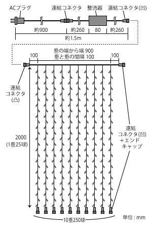 縦方向にも横方向にも連結可能なLEDカーテンライト(常時点灯タイプ)の基本セットです。