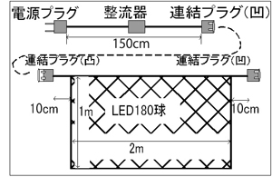 | 商品名 | LEDイルミネーション、ネット(網状)、常点、レギュラー仕様(ツエナー無)、180球、シルバーコード、レッド |
